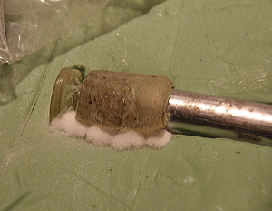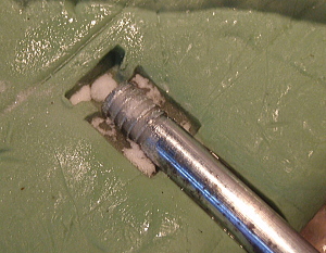3/4できたら、最後が難しいです。 最後の1/4はいきなり作れません。 形成したものが型の入り口をふさいでしまいます。 わずかに回転を戻して、隙間からアクリル樹脂粉末を入れて固めます。 |
