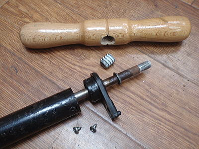 スーパーピスタは木製の大きなハンドルが付いています。 ハンドルの中には雌ネジがねじ込まれていますが、症例ではネジの頭の部分(シャフトにハマっているワッシャーに見えるもの)がモゲていて、ハンドル内の噛み合わせがバカになっていました。 ピストンシャフトの分解には、このモデルではキャップを止めている2本のビスを外せばokです。 |