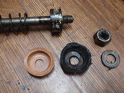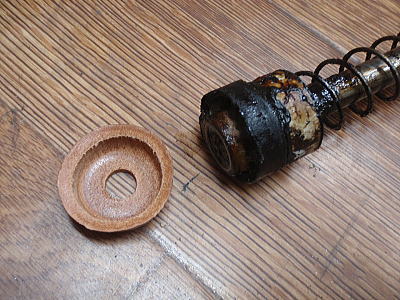 ピストン・シャフトを抜くと、先端に油で固まった真っ黒なパッキン! ヘタってスカスカで圧がかからない状態でした。 新品の皮パッキンとの比較。 |