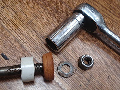 パッキンの着脱の17mmナットだけれど、工具はソケットツールがベストです。 皮を変形させなくて済みますから。 写真ではディープ・ソケットを使っていますが、スタンダードな長さでokです。 (なぜロングを持ってるか? 足場パイプを組む時にすごく便利です。) |