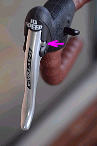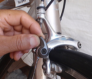 | B、カンパ レバー側のストッパーを押し込むとレバーが開いて、キャリパーも開く。 |