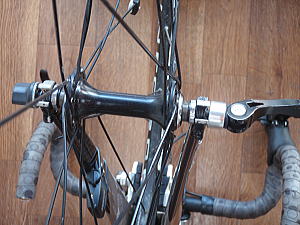 | D 後輪を外します。 ハブのクイックを解除します。前輪と違い、ナットを緩める必要はありません。 変速機が邪魔しているので、後方に引きながら、後輪を抜きます。 |