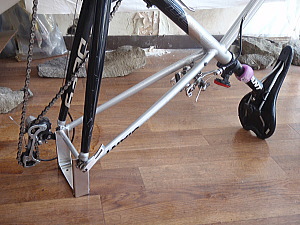 | F 外した前後車輪でフレームを挟みます。 前輪が写真手前でクイックレバ−が外側。 後輪は向こう側、スプロケット(ギヤ)が内側です。 スプロケットには軍手を裏返して被せるとフレームの保護になります。 クランクの位置に注意。Iの写真参照。 ハンドルは向こう側に |
