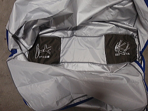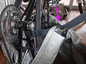 | K 輪行袋を広げ自転車を置きます。 実は方向性があり、無視すると袋にうまく収まりません。 「オーストリッチの輪行袋 L-100」は、収納位置を示す絵が描かれています。 サドルの位置、エンドの位置を合わせます。 |