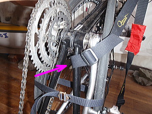 | 上から締めます ダウンチューブと2本の車輪をまとめてベルトで仮固定します。 締めすぎないように →ベルトの使い方 |