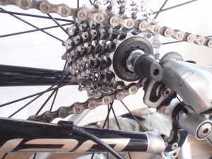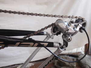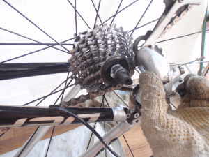 | C 後輪装着はチェーンに馴れないと手間取ります。 変速機がヘンな位置になって絡んでいませんか。 前ギアからくる上下平行なチェーンの間に後輪のギア(スプロケット)を入れます。 |