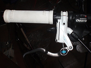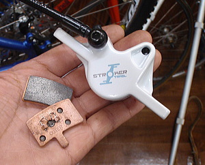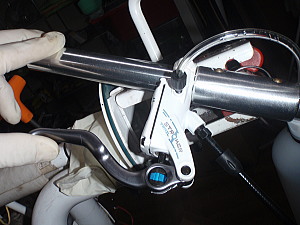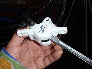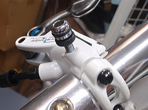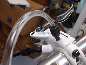 14) あとはブレーキシステムをフレームに戻せばOKです。 レバーをハンドルに装着します。 4mmアーレンキー使用。 キャリパーにパッドを戻し、フレームに装着します。 5mmアーレンキーを使う。 調整して、ブレーキの効きを確認して、ホース結合部からフルードが漏れてなければ完了です。 |