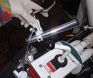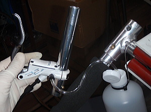調整スタンドにセットしたブリーディング治具のこのTバーは何を流用したかわかりますか? 一世を風靡したキックスケーターのハンドル部です(改造で切り取った廃品) コレだと瞬時にハンドルを分離できるので、どんな角度にもなるから気泡を逃がしやすいです。 通常のハンドルに付けたままの場合はレバー取付けボルトを緩めて回転できるようにしておきます。 |
