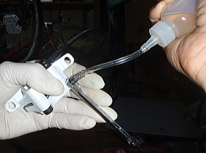 7) キャリパーから気泡がまったく出なくなったら、今度はマスタシリンダー側(=レバー側)から排出されるフルードをチェックします。 ボトルをニギニギして、フルードを送り込みます。 最初は大きかった気泡がだんだん小さくなります。 |