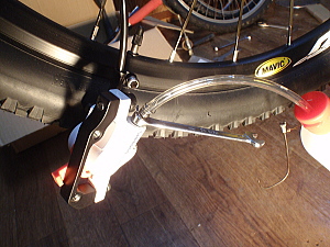 6) ブレーキレバーを握った状態にします。 一人で作業してる場合はストラップで締めておきます。 |
