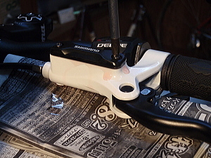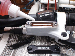 油圧ディスクブレーキのマスターシリンダー(レバー)〜ホース〜キャリパーを結ぶオイルラインにフルード(液:通称オイル)を満たす作業は、メーカーや機種ごとに微妙に異なります。 中の気泡をいかに追い出して行なうかがテーマとなります。 今回のモデル、シマノ・デオーレM486、リザーバータンクが上方に付いているスタンダードタイプです。 シマノはBLタイプと呼んでいます。 キャリパー側(ブレーキ本体側)から注入する方法とリザーバータンク側(レバー側)から注入する二つのやり方があります。 今回はリザーバータンク側(レバー側)から注入する方法です。 |