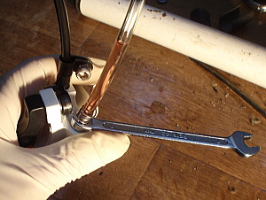 7) ブリードニップルを瞬間開け閉め(約0.5秒間)してキャリパー内の気泡を排出させます。 上の動作からの一連を2〜3回繰り返して気泡がまったく出なくなればキャリパーはOKです。 その後ブリードニップルを締め付けます。 |