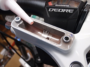2) リザーバータンクが地面と水平になるようにセットし、リザーバータンクのふたとダイヤフラム(ゴムパッキン)を取り外します。 ブリードニップルを1 / 8回転ゆるめて開き、ミネラルオイルをタンクに注入します。この状態で、ブレーキレバーをゆっくり動かし、油の注入を補助します。 |
