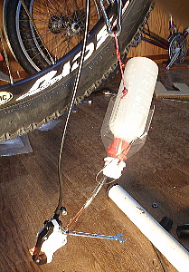 1) キャリパーを外して、ハンドルからぶら下げるようにします。 キャリパーのブリードニップルに7mmのメガネレンチをセットし、チューブをブリードニップルに差込みます。 通常はチューブ末端に排油を受けるビニール袋を被せて、輪ゴムかテープで止めておきます。 今回は排出ボトルを使いました。 キャリパーにはかならずスペーサーをかませてください。怠るとピストンがひどいことになります! |