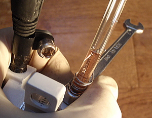 4) オイルがホースの中に入っていくとリザーバータンクの油面が下がるのでポート(底の穴)から空気を吸わないようオイルを補充し油面を維持します。 | |