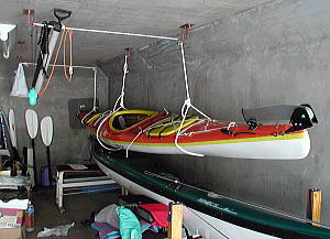 ソランダーを下のラックに、ハルシオンを天井に吊っています。 艇庫を作る際、天井に6ヶ所頑丈なフックを付けてもらいました。重宝しています。 |